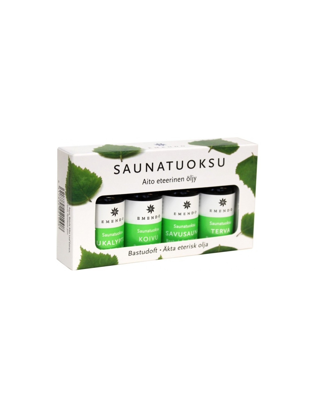 Esencias para sauna Emendo en envase de 4 Uds de 10 ml cada una: Esencia de Eucalipto, Abedul, Humo de sauna y Tar.