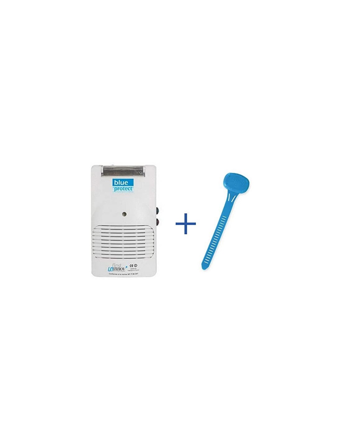 Kit de seguridad infantil Blue Protect para prevención de accidentes en piscinas. Este sistema inalámbrico (fácil de instalar sin cables) incluye una alarma de pared y un brazalete-sonda para el niño. Homologado bajo la estricta normativa internacional NF 90-307-1.